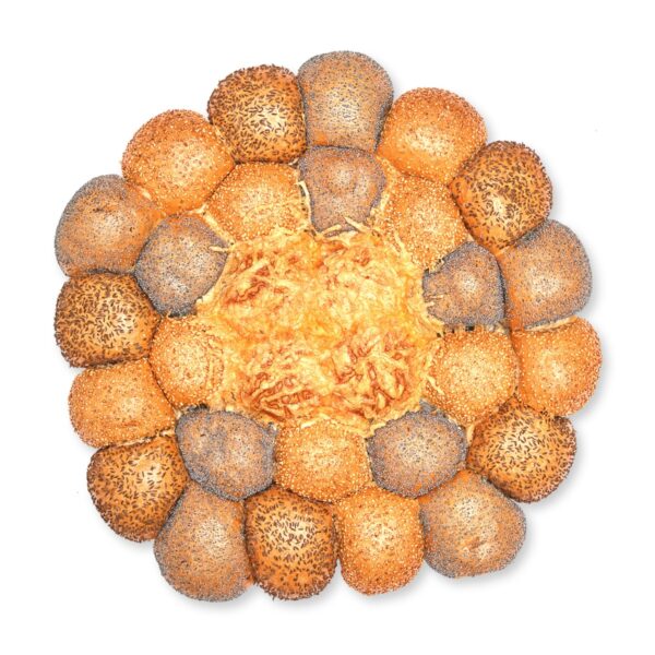 Weizenmehl Type 550 (58,7%) , Wasser, geröstetes Malzmehl (Weizen, Gerste), Gouda, Hefe, Salz-jodfrei, Sesamsamen, Kümmel, Mohn, Zucker, Traubenzucker, Spuren anderer Allergene