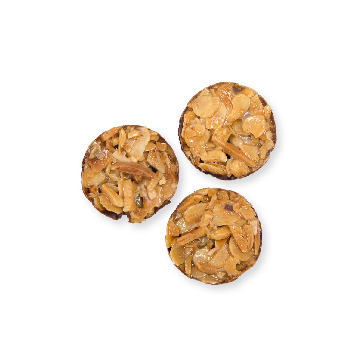 Mandeln, Kuvertüre (Kakaomasse, Zucker, Kakaobutter, Sojalecithin, Burbonvanille-Extrakt), Knusperdekor (Zucker, Glucosesirup, Sönnenblumenöl, Honig, Sahne (30%Fett), Aroma), Mandeln gestiftet, Butter, Honig, Vollmilchpulver, Spuren anderer Allergene
