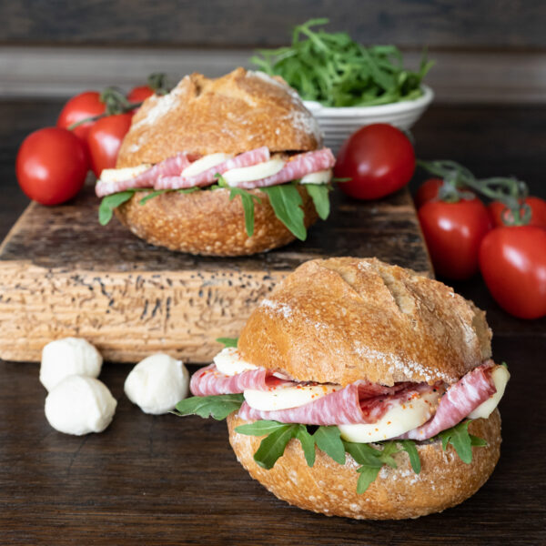 Kölner Tradition trifft la dolce vita: unser Handstück belegt mit feiner italienischer Salami, Mozzarella und frischem Rucola. Muss man probieren!