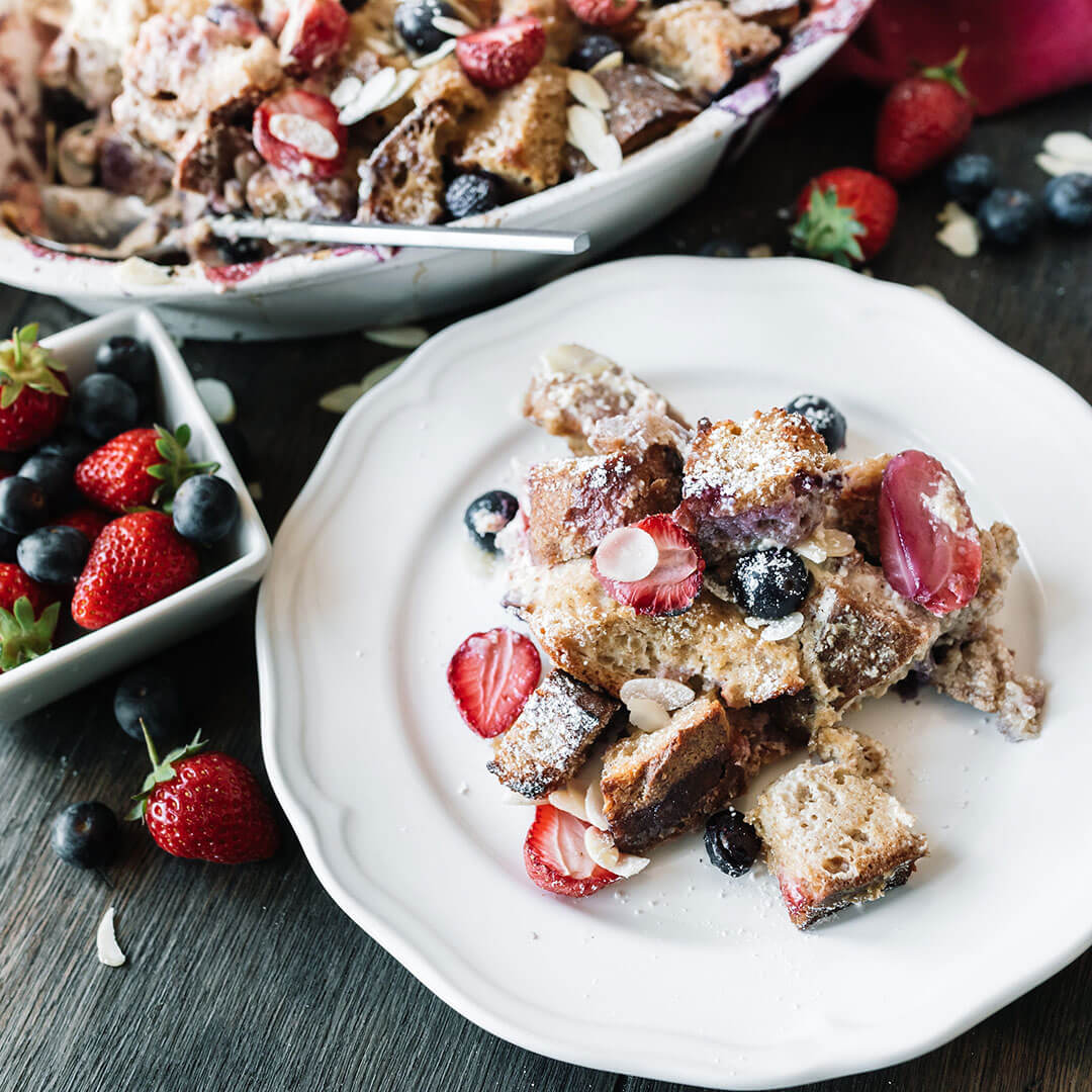 Mal wieder zu viel Brot gekauft und es sind nach einigen Tagen noch ein paar Scheiben übrig? Bloß nicht wegschmeißen! In unserem Rezept des Monats zeigen wir Ihnen, wie sie das Brot in einen absoluten Frühstücks-Klassiker verwandeln – French Toast! Bei dieser Variante wird er als Auflauf serviert und eignet sich so für Frühstück in größerer Runde. Da die Scheiben nicht einzeln in der Pfanne gebraten werden müssen, kann der Auflauf super vorbereitet werden und ist unkompliziert. Die Scheiben am besten dick schneiden, so wird es besonders lecker. Wir haben für unser Rezept das Schweizerbrot verwendet aber können auch andere Sorte mit Weizenmehlanteil empfehlen wie zum Beispiel das Hausbrot, Baguettestangen oder die Schwarzwälder Kruste. Abgerundet wird der Frühstückstraum mit frischen Beeren. Wer diese aber gerade nicht im Haus hat, kann die gleiche Menge gefrorener Beeren verwenden.